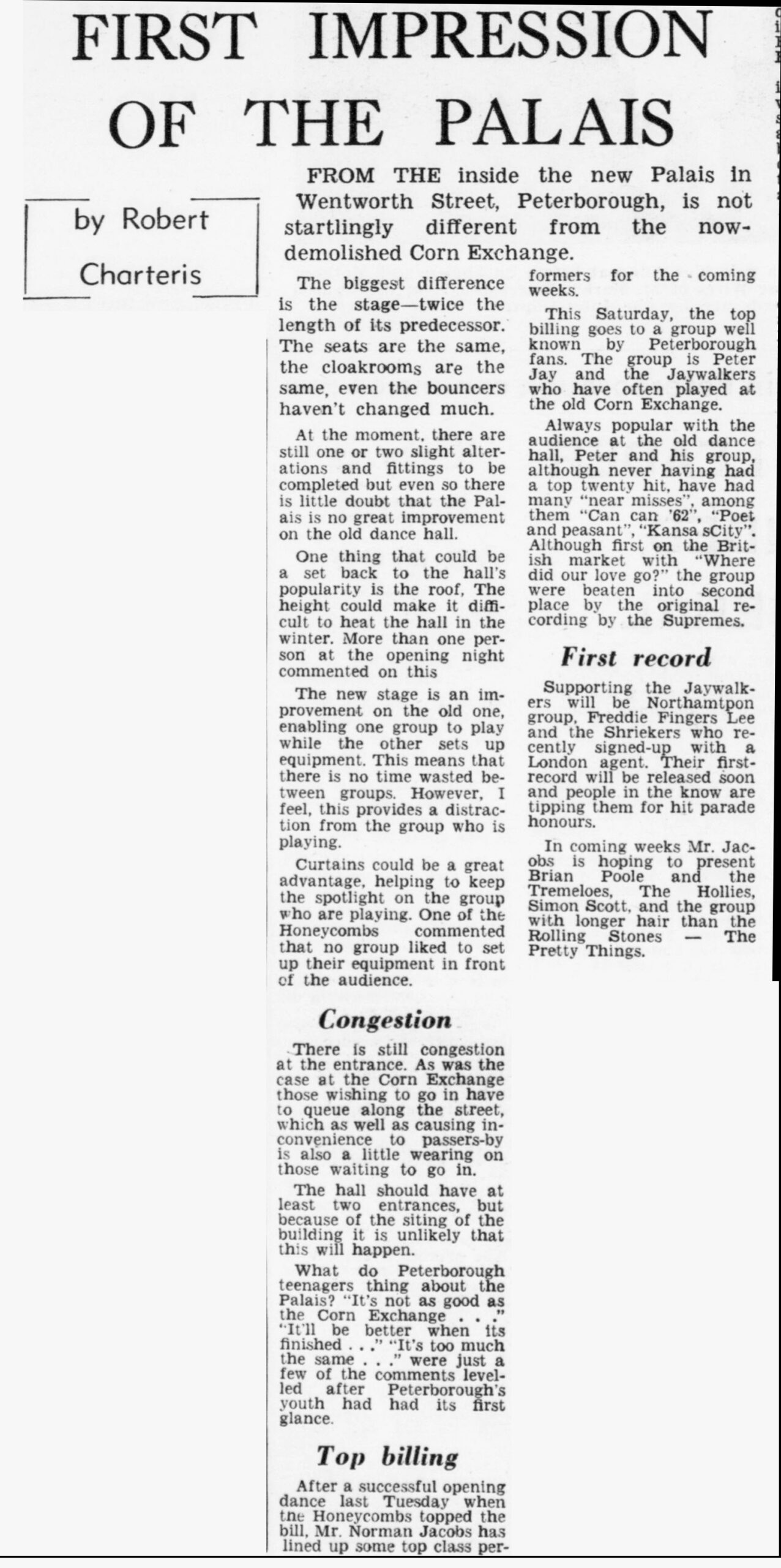 The venue was established by Wisbech promoter Norman Jacobs who had provided the city with entertainment at the Corn Exchange right up to its final show in May 1964. On failing to secure a renewal of his lease at the Corn Exchange, Jacobs pledged a bigger and better venue on Wentworth Street and the 2,000 capacity venue was rushed into completion for an opening night, featuring The Honeycombs, on 29th September 1964.